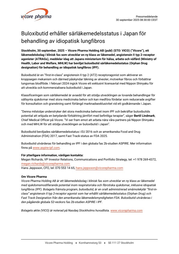 Stockholm, 30 september, 2025 – Vicore Pharma Holding AB (publ) (STO: VICO) (”Vicore”), ett läkemedelsbolag i klinisk fas som utvecklar en ny klass av läkemedel, angiotensin II typ 2-receptor agonister (ATRAGs), meddelar idag att Japans ministerium för hälsa, arbete och välfärd (Ministry of Health, Labor and Welfare, MHLW) har beviljat buloxibutid särläkemedelsstatus (Orphan Drug designation) för behandling av idiopatisk lungfibros (IPF).