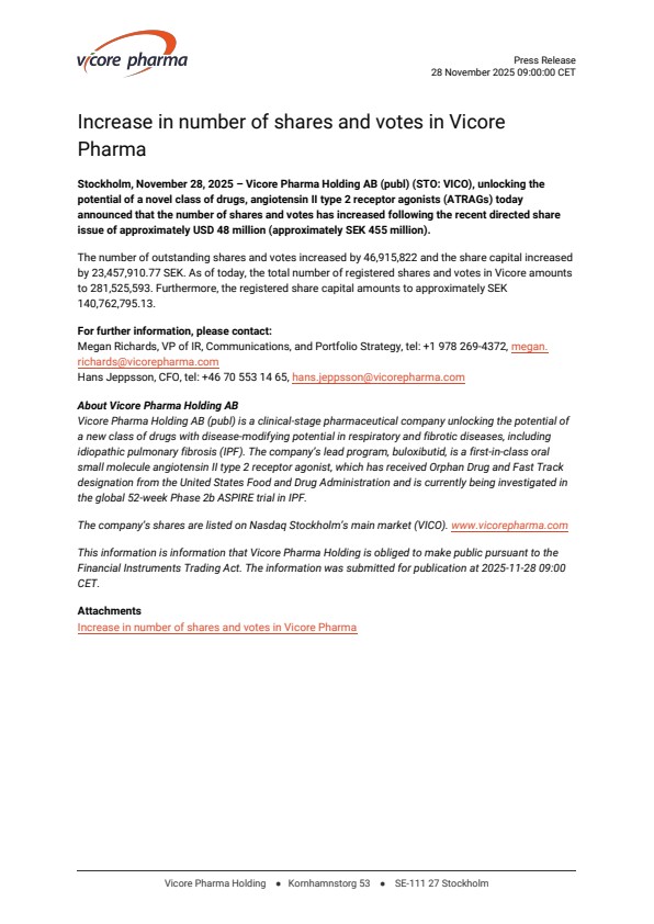 Stockholm, November 28, 2025 – Vicore Pharma Holding AB (publ) (STO: VICO), unlocking the potential of a novel class of drugs, angiotensin II type 2 receptor agonists (ATRAGs) today announced that the number of shares and votes has increased following the recent directed share issue of approximately USD 48 million (approximately SEK 455 million).