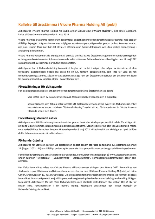 Aktieägarna i Vicore Pharma Holding AB (publ), org.nr 556680-3804 (”Vicore Pharma”), med säte i Göteborg, kallas till årsstämma onsdagen den 11 maj 2022.