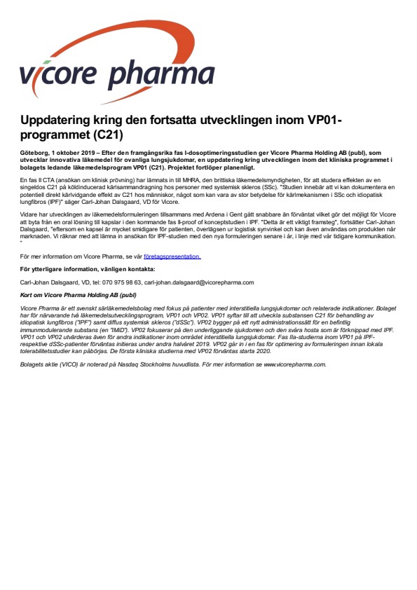 Carl-Johan Dalsgaard, VD, tel: 070 975 98 63, carl-johan.dalsgaard@vicorepharma.com