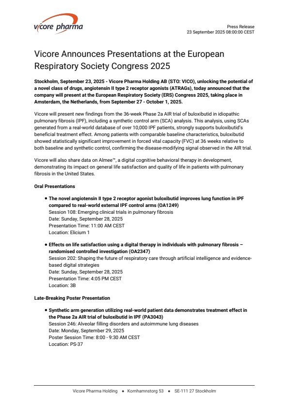 Stockholm, September 23, 2025 – Vicore Pharma Holding AB (STO: VICO), unlocking the potential of a novel class of drugs, angiotensin II type 2 receptor agonists (ATRAGs), today announced that the company will present at the European Respiratory Society (ERS) Congress 2025, taking place in Amsterdam, the Netherlands, from September 27 – October 1, 2025.