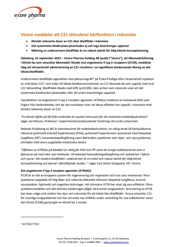 Göteborg, 22 september 2022 – Vicore Pharma Holding AB (publ) (”Vicore”), ett läkemedelsföretag i klinisk fas som utvecklar läkemedel riktade mot angiotensin II typ 2-receptorn (AT2R), meddelar idag att intraarteriell administrering av C21 resulterar i en signifikant dosberoende ökning av det lokala blodflödet.