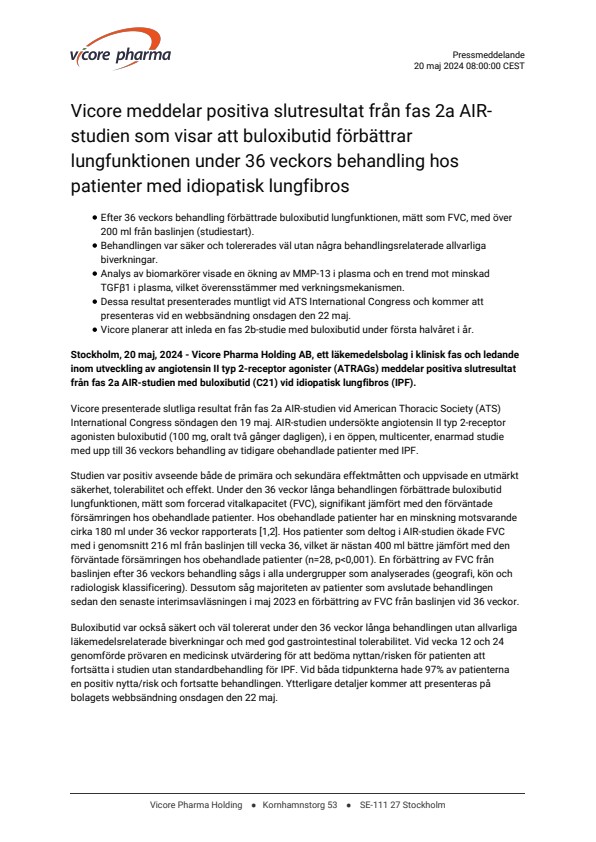 Vicore presenterade slutliga resultat från fas 2a AIR-studien vid American Thoracic Society (ATS) International Congress söndagen den 19 maj. AIR-studien undersökte angiotensin II typ 2-receptor agonisten buloxibutid (100 mg, oralt två gånger dagligen), i en öppen, multicenter, enarmad studie med upp till 36 veckors behandling av tidigare obehandlade patienter med IPF.