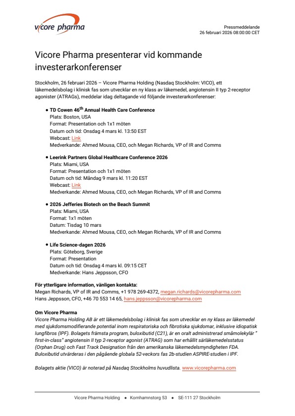 Stockholm, 26 februari 2026 – Vicore Pharma Holding (Nasdaq Stockholm: VICO), ett läkemedelsbolag i klinisk fas som utvecklar en ny klass av läkemedel, angiotensin II typ 2-receptor agonister (ATRAGs), meddelar idag deltagande vid följande investerarkonferenser: