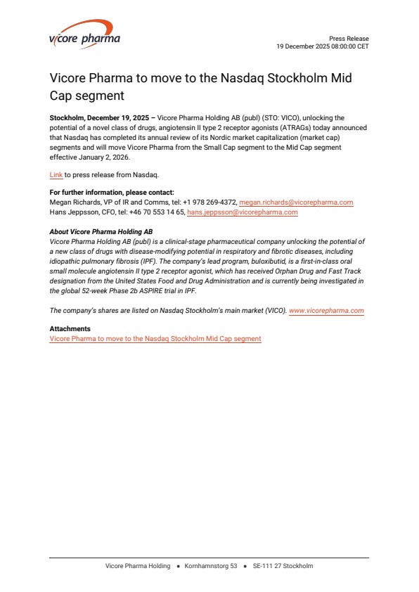 Stockholm, December 19, 2025 – Vicore Pharma Holding AB (publ) (STO: VICO), unlocking the potential of a novel class of drugs, angiotensin II type 2 receptor agonists (ATRAGs) today announced that Nasdaq has completed its annual review of its Nordic market capitalization (market cap) segments and will move Vicore Pharma from the Small Cap segment to the Mid Cap segment effective January 2, 2026.