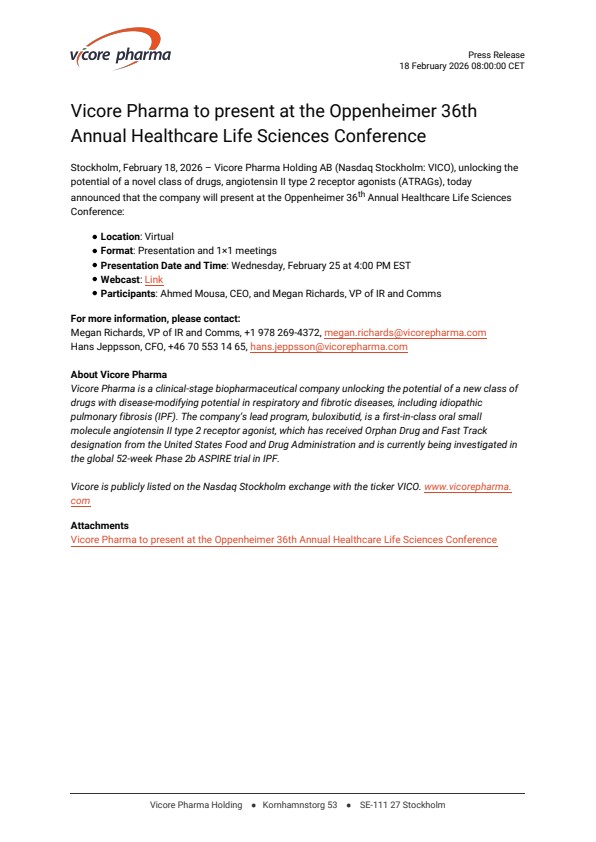 Stockholm, February 18, 2026 – Vicore Pharma Holding AB (Nasdaq Stockholm: VICO), unlocking the potential of a novel class of drugs, angiotensin II type 2 receptor agonists (ATRAGs), today announced that the company will present at the Oppenheimer 36th Annual Healthcare Life Sciences Conference: