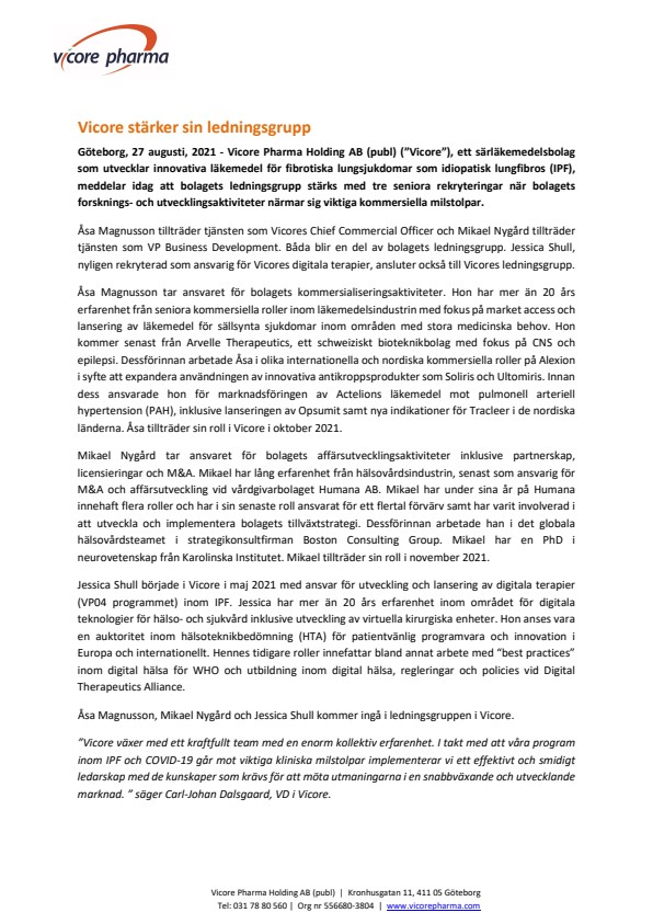 ”Vicore växer med ett kraftfullt team med en enorm kollektiv erfarenhet. I takt med att våra program inom IPF och COVID-19 går mot viktiga kliniska milstolpar implementerar vi ett effektivt och smidigt ledarskap med de kunskaper som krävs för att möta utmaningarna i en snabbväxande och utvecklande marknad. ” säger Carl-Johan Dalsgaard, VD i Vicore.